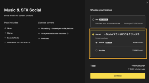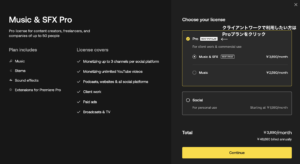 「個人のYouTube動画のみで使用したい」「まずは気軽に始めたい」という方は、「Music & SFX Social」プランでも問題ありません。